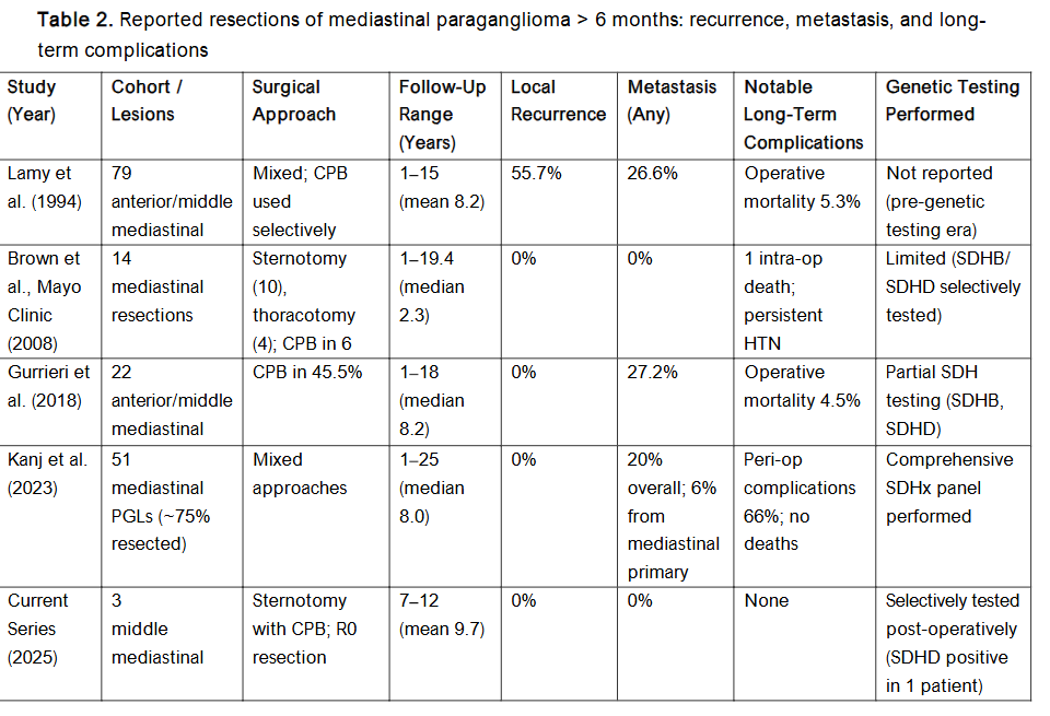 Imaging follow-up increasingly favors 68Ga-DOTATATE PET/CT for detection of multifocal or metastatic disease and for surveillance in SDH mutation carriers; MIBG sensitivity can be limited in thoracic/cardiac PGLs. Due to the genotype-linked metastatic risk, post-operative surveillance is recommended even after R0 resection. R0 surgery, often with planned CPB, provides lasting local control with low recurrence for resectable mediastinal PGLs. The risk of metastasis is influenced more by tumor biology (e.g., SDHx) than by the mediastinal location alone. Our series provides enduring, empirical validation of these trends. Table 2 summarizes major mediastinal PGL study cohorts.