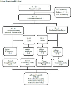 In this study, 128 patients were enrolled, 126 of whom completed the study. Patients include both males (52.3%) and females (47.7%) with the age range between 28 to 75 years belonging to the race, Asians. Demographic characteristics including age, height, weight, and body mass index showed no significant differences between the Vildagliptin 100mg SR tablet and Sitagliptin 100mg tablet arms.