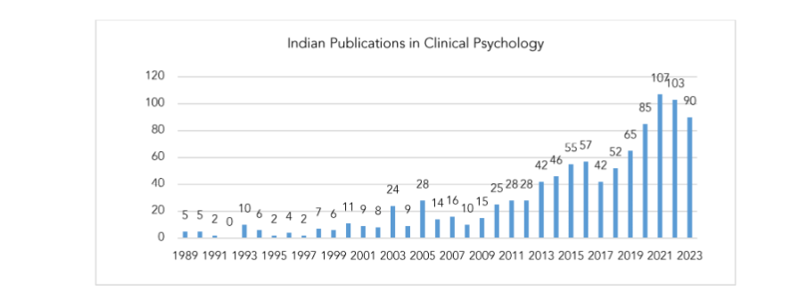 The scientometric assessment of global clinical psychology publications, based on Web of Science data, reveals significant trends in the field. Overall, the volume of publications has increased, indicating a growing global interest in mental health issues. Though fluctuations in the data have been observed throughout the time frame, the noticeable no. of publications drop after the year 2019 could be attributed to COVID-19. The Relative Growth Rate of global publications decreased and the doubling time for the publications increased from 1990 to 2023. Countries like the United States, the UK, and Germany dominate the field due to their strong academic institutions and substantial funding. India collaborates the most with the USA, England and Australia. The interdisciplinary nature of the field, with overlap in neuroscience, psychiatry, and public health, has led to more comprehensive research outcomes addressing complex mental health issues. Key research areas, such as psychiatry, neuropsychology, psychopathology, family studies, health psychology, Substance abuse and Rehabilitation continue to drive innovation and inform evidence-based practices for advancing mental health care globally.
