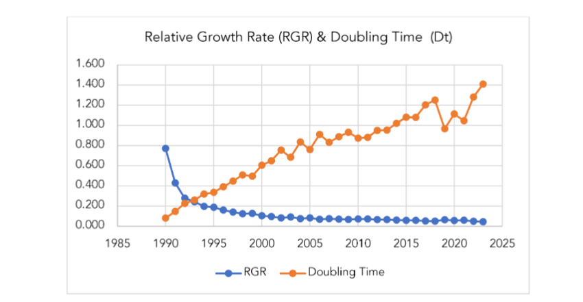 Figure 1.3: Relative Growth Rate and Doubling time of publications