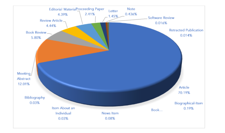 The maximum no. of publications has been produced in the form of articles i.e., 194310 (70.199%), followed by meeting abstracts i.e., 33218 (12.001%), and book reviews (16062, 5.803).