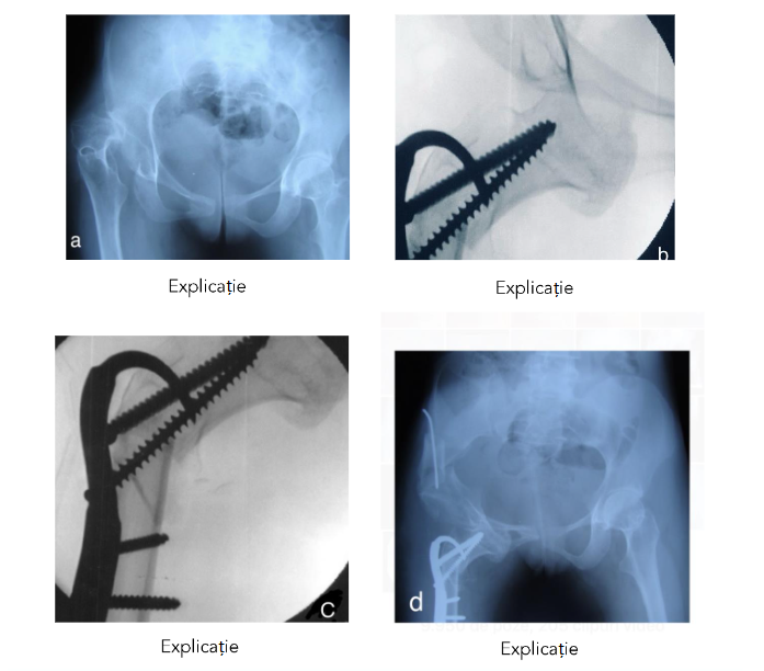 c) fluoroscopic appearance of subtrochanteric osteotomy and trochantero-capital osteosynthesis;