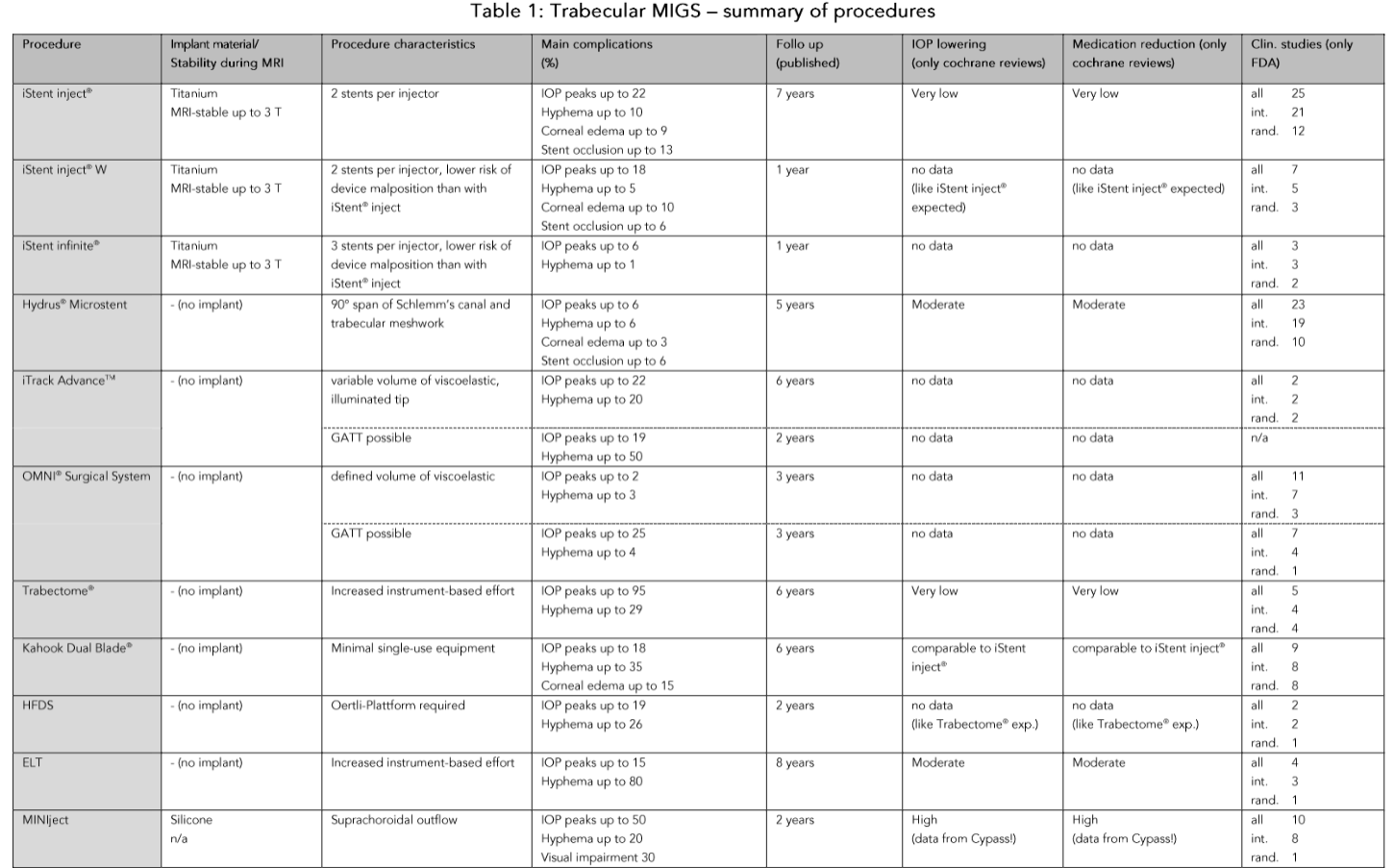 | iStent® | Titanium | 1 year | Very low | 12 | 50-60% | 2 | 1 |