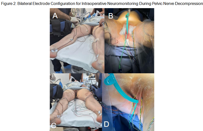 Figure 2. Bilateral Electrode Configuration for Intraoperative Neuromonitoring During Pelvic Nerve Decompression Figure 2. AD. Final setup of subdermal electrodes for intraoperative neurophysiological monitoring (IONM) prior to laparoscopic pelvic nerve surgery. The images illustrate the completed configuration of bilateral needle electrodes placed in lower limb and perineal muscles, following anatomical landmarks and prior to trocar placement and surgical draping.