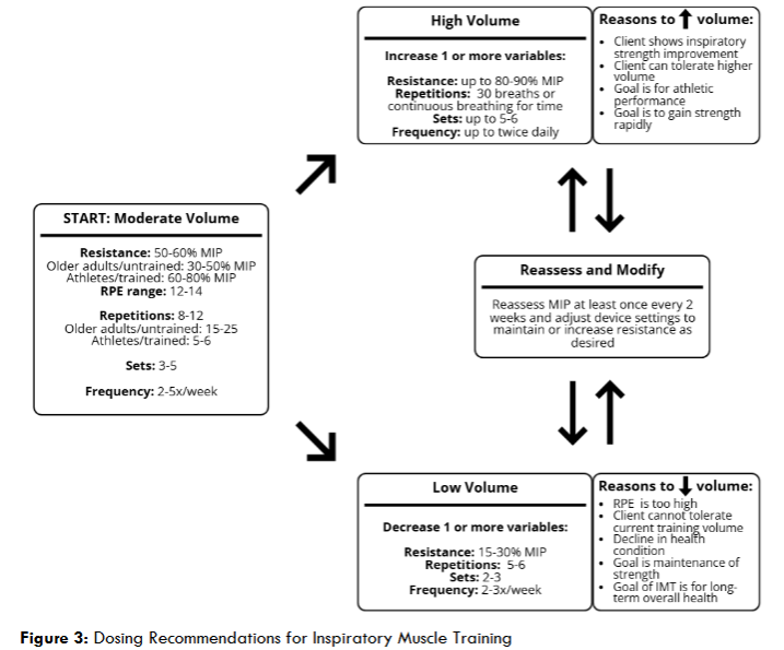 Published treatment protocols for IMT vary widely with respect to intensity, frequency, duration or repetitions, and overall length of the intervention. As IMT is a form of resistance training, it is prudent to follow similar principles as those used in resistance training of the peripheral muscles. In general, the total volume of work needs to be assessed when attempting to increase or decrease the dose of intervention. In order to quantify inspiratory training volume across varying IMT protocols, Palermo et al. defined the variable “Work-%” as the total number of weekly training breaths (repetitions x sets x sessions per week) multiplied by the resistance (expressed as %MIP). Our recommendations for dosing reflect adaptation of the American College of Sports Medicine guidelines for peripheral strength training. With guidelines for strengthening peripheral muscles in mind, complemented by a review of the literature that has investigated IMT, we propose using Work-% to create categories of low, moderate, or high inspiratory muscle training volume.