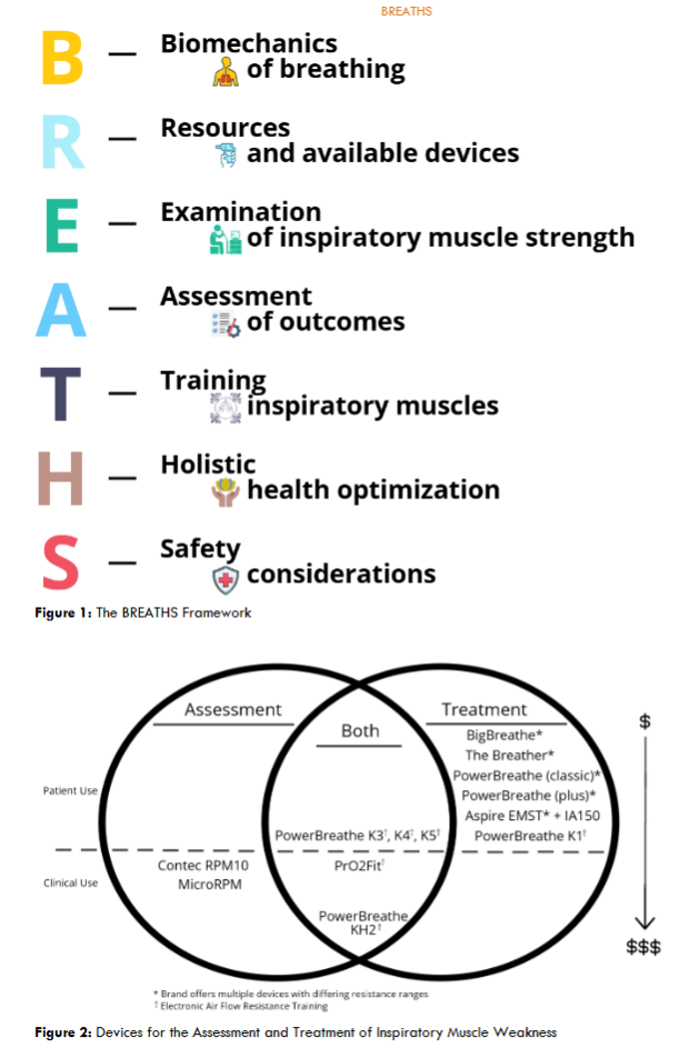 In this review article, author commentary is based on selected articles that have been recently published that highlight considerations related to the biomechanics of breathing, assessment of inspiratory muscle strength, assessment of functional outcomes, and dosage of treatment interventions for strengthening inspiratory muscles. The search strategy focused on contemporary research related to IMT conducted in large groups of patient populations across a variety of age ranges and diagnoses. Additionally, articles that exclusively investigated inspiratory training and not expiratory muscle training were chosen for the purposes of this paper. Further, articles that incorporated various outcome measures that assessed holistic health improvements were selected to provide the reader with a comprehensive understanding of the value of strengthening inspiratory muscles. Finally, guidance for the examination of inspiratory muscle strength was sought from a scientific statement provided by the European Respiratory Society. Commentary within this paper focuses on the ways physical therapists can integrate the knowledge related to the examination and treatment of inspiratory muscles within clinical practice. Authors specifically identify areas of consideration and cite selected articles related to each aspect of the BREATHS framework. This article is not a systematic review or scoping review and so the authors make no claims that the selection of articles is free from bias. The authors simply put forward thoughts for reasonable consideration that can be used in clinical practice.