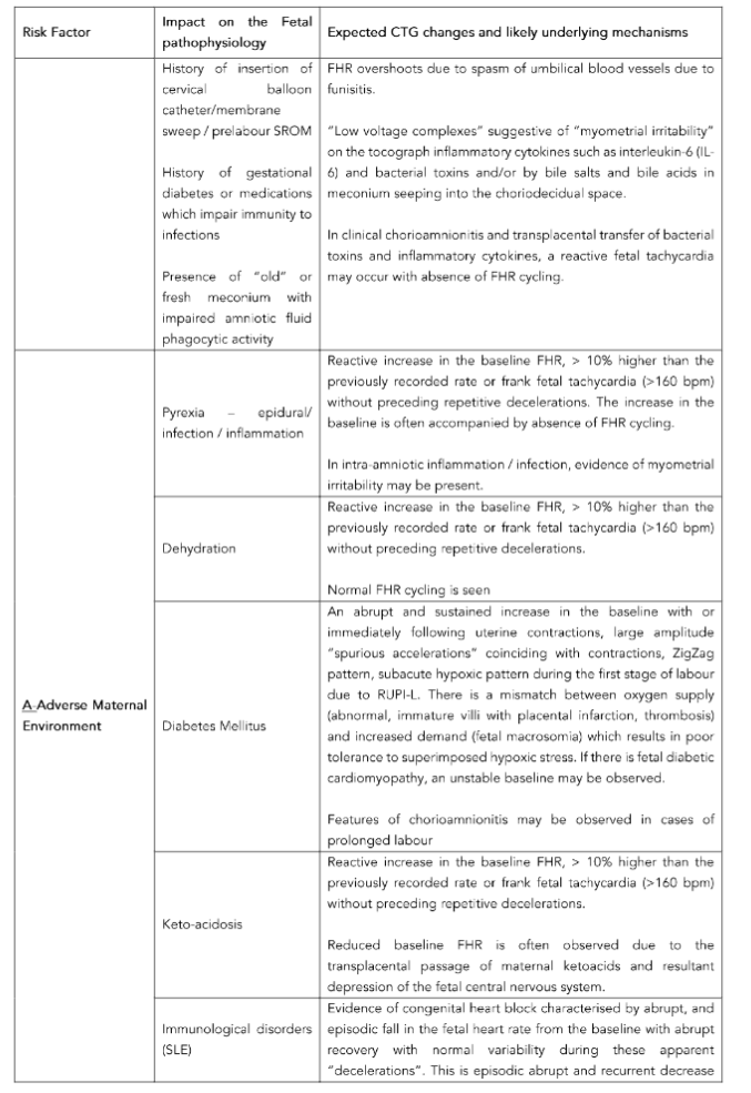 It must be appreciated that not all underlying risk factors will immediately manifest the expected changes on the CTG, and some may start their detrimental effects on the fetal metabolic, biochemical, cardiovascular neurological systems hours later.