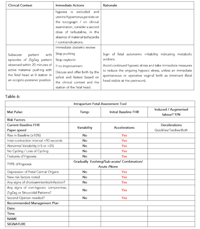Table 5 provides examples of how management can be tailor-made to the identified clinical context, and this should be used in conjunction with the recommended intrapartum fetal assessment tool (Table 6).