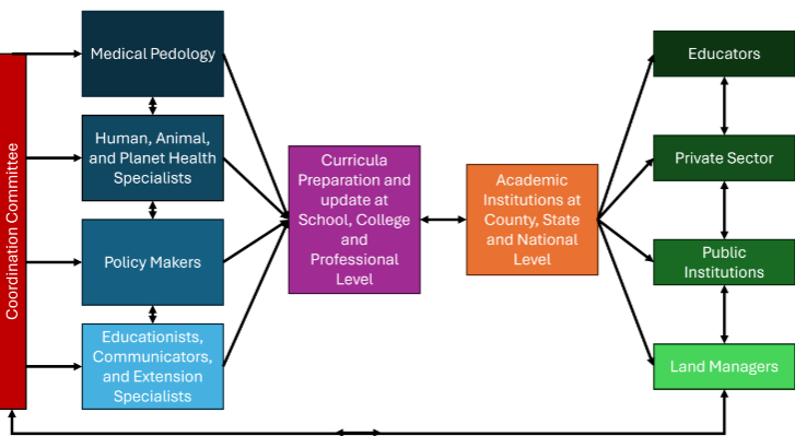 A well-conceptualized action plan is needed to address this issue of soil degradation as global human and public health emergency. Action plan may involve a coordination committee which works with representatives of different organizations including academicians in medical pedology who address human health as influenced by animal and plant health, policy makers and outreach organizations including communicators and extension specialists. The aim is to revise and update curricula at school, college and professional levels and communicate this to academic institutions who work with private and public sectors on the one hand and land managers and educators on the other. There should be a well-defined mechanism for providing the feedback to the overall coordination committee. An operational mechanism, at all geographical levels is needed, to involve food producers (farmers, ranchers, horticulturists, and poultry and fishery industry) and food processing and distribution organizations which work together to provide healthy food grown on healthy soils. Furthermore, producers must be appropriately rewarded for producing high quality food by adopting sustainable systems of managing soil health. Sources of these funds may come from consumer but also from private and public sectors.