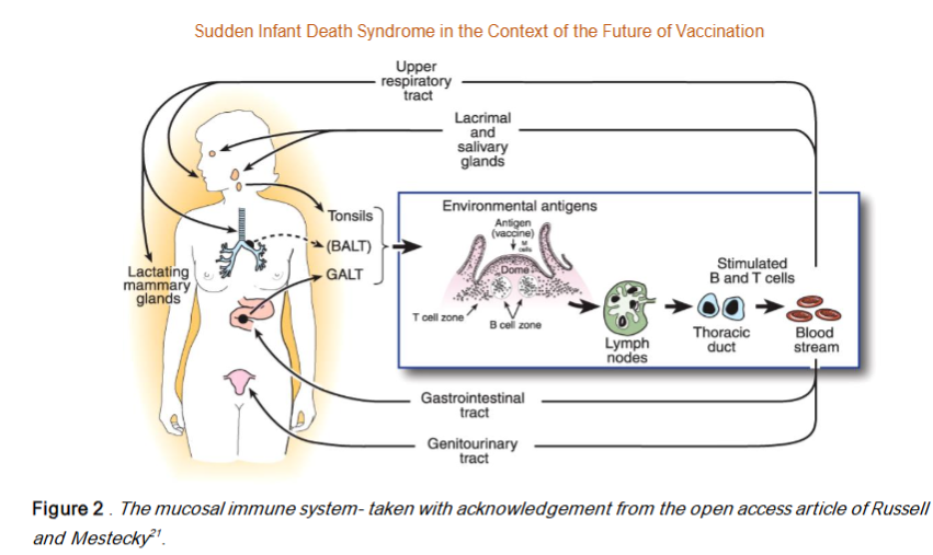 Thus, by drawing attention to the possible underlying immunological-driven causes of SIDS we also draw attention to potential downstream consequences on normal childhood development (in those babies that survive the first year of the childhood vaccine schedule). Here we take this analysis further and focus on the mucosal immune system as the preferred target for all future vaccines given to children and adults via the intranasal inhalation or application route of immunisation.
